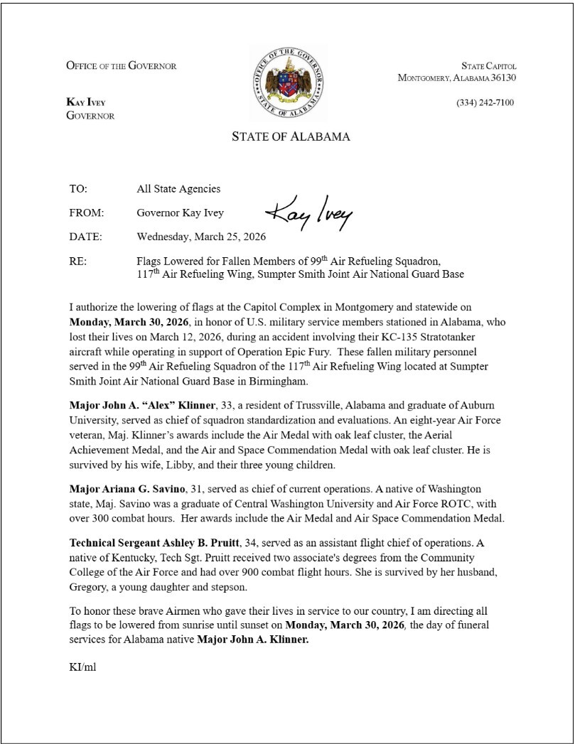 Governor Ivey ordered the lowering of flags at the Capitol Complex in Montgomery and statewide Monday March 30, 2026, in honor of U.S. Military service members stationed in Alabama, who lost their lived on March 12, 2026 during an accident involving their KC-135 Stratotanker aircraft while operating in support of Operation Epic Fury. Monday, March 30, 2026 is the day of the funeral services for Alabama native Major John A. Klinner.